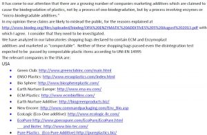 Alerta da Universidade de Pisa ao FTC sobre empresas de aditivos que alegam biodegradação de plásticos por processo envolvendo enzimas ou aditivos micro biodegradáveis. Na opinião do Prof. Emo Chiellini, estas alegações de biodegradação é uma provável enganação pública e pede investigação.