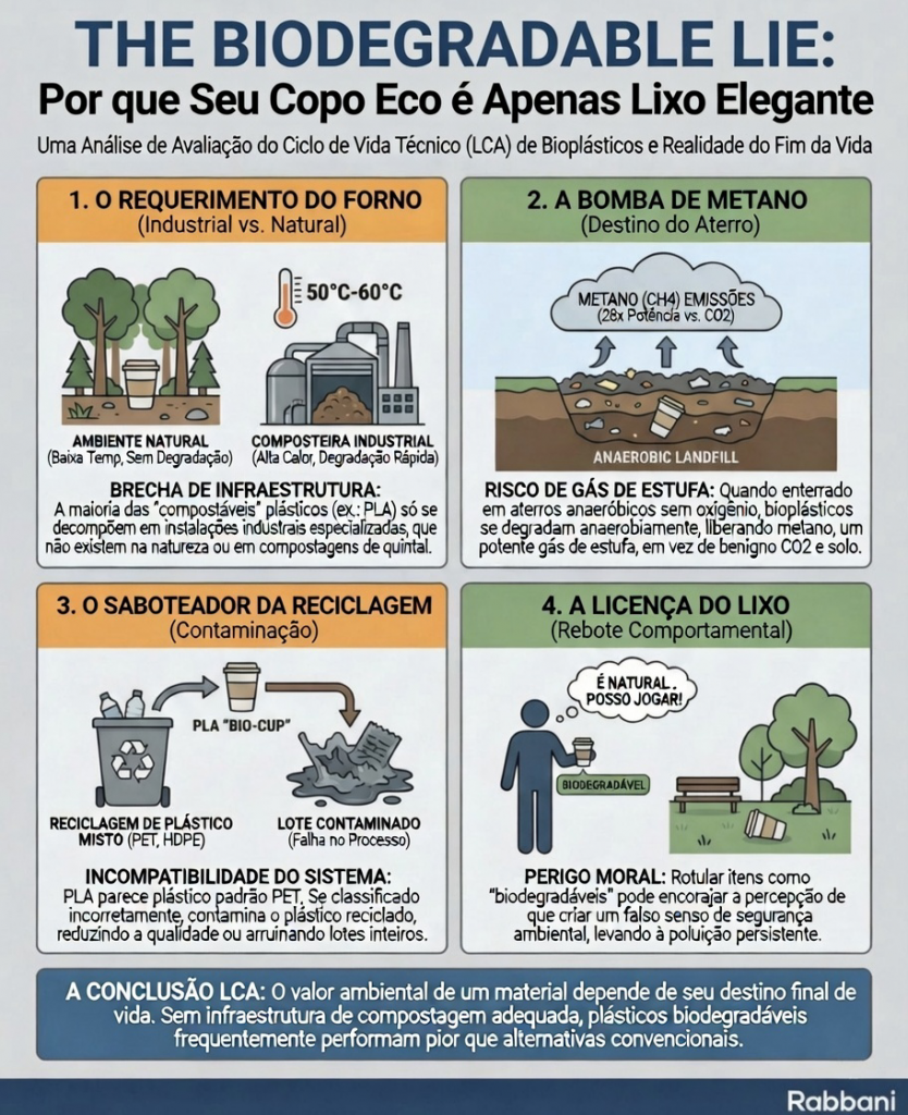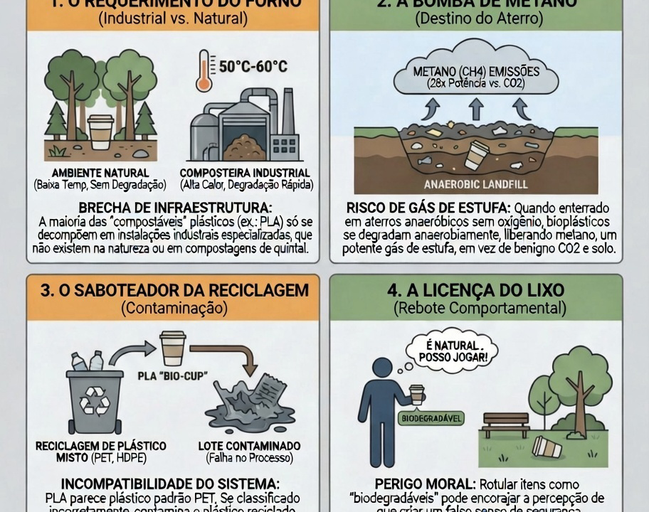 Bioplásticos e os chamados plásticos biodegradáveis não necessariamente se decompõem rapidamente, ou de forma alguma, em condições encontradas em solos ou no ambiente. Plásticos biodegradáveis e “compostáveis” frequentemente precisam ser expostos a condições muito específicas, como calor alto, para se desintegrarem.